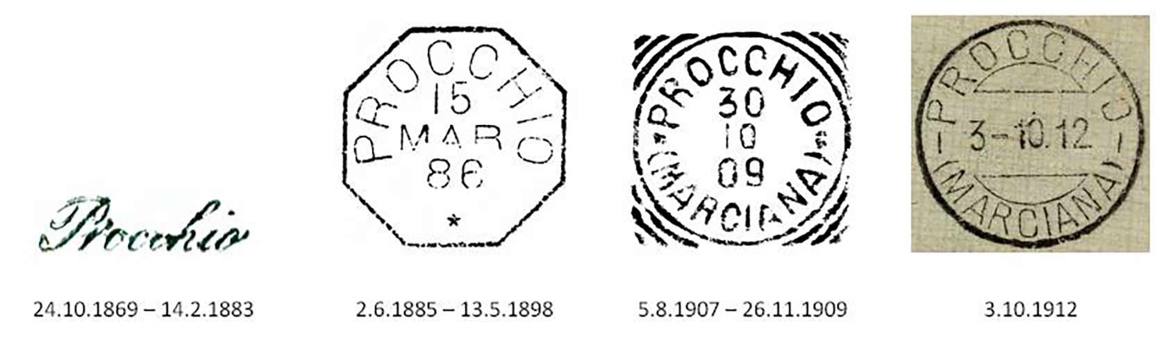 Contemporaneamente al ritrovamento dell’impronta del tondo riquadrato PROCCHIO (MARCIANA) del 30 ottobre 1909, fatto in maniera del tutto casuale dall’autore in un archivio di una cooperativa locale finito al macero, Raffaele Zefferi ha reperito un’altra impronta (5 agosto 1907), sempre impressa in arrivo, che rappresenta la prima data al momento conosciuta.