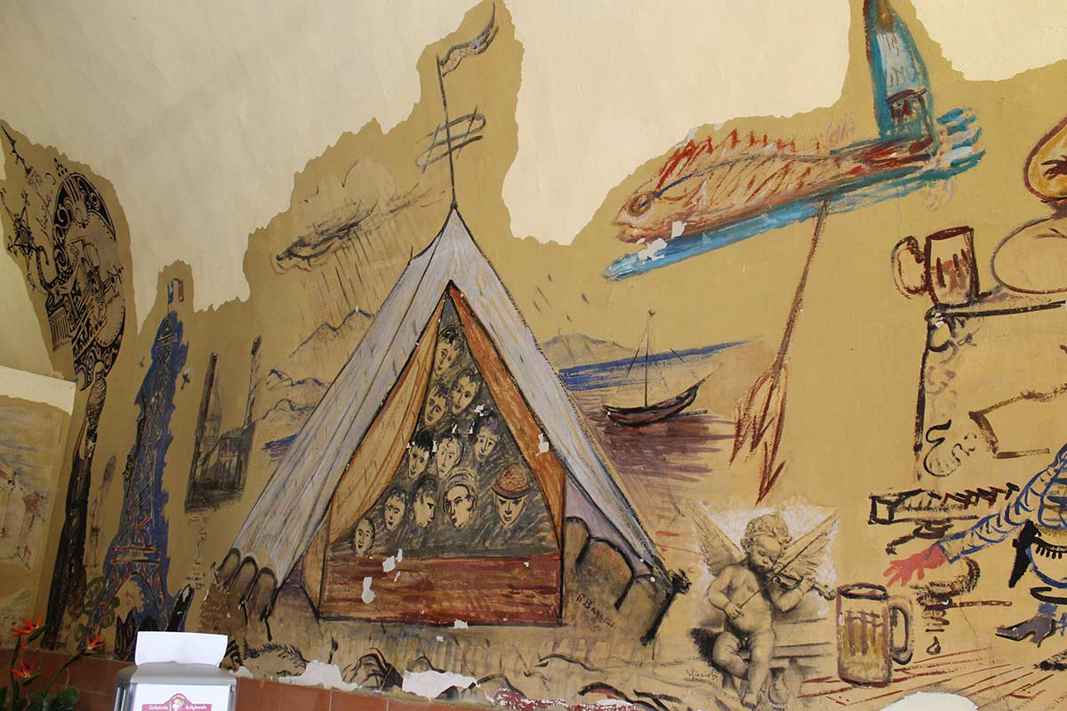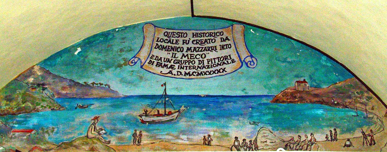 Veniva a cercare l’originale del suo amato asino e restava lì per ore, mentre i genitori, invece, guardavano il resto». Il resto sono gli affreschi dei pittori delle dune, certo, ma anche quelli di chi li raggiunse, come Felice Carena, Valentino Ghiglia o Denis Martinez, noto pittore algerino, nonché i tratti anonimi di chi venne qui a inseguire un ideale. Tutti quei pittori che si riunirono sotto l’egida del cosiddetto “Meco”, il vecchio oste omaggiato sull’affresco più grande, che, in fondo alla sala, su un golfo di Procchio estivo e festante occupato soltanto da pescatori e pittori, recita: «Questo historico locale fu creato da Domenico Mazzarri dicto “Il Meco” e da un gruppo di pittori di famae internazionale». Laddove il genitivo maccheronico “famae” va letto e interpretato seguendo la pronuncia. Non fama, cioè. Ma fame.